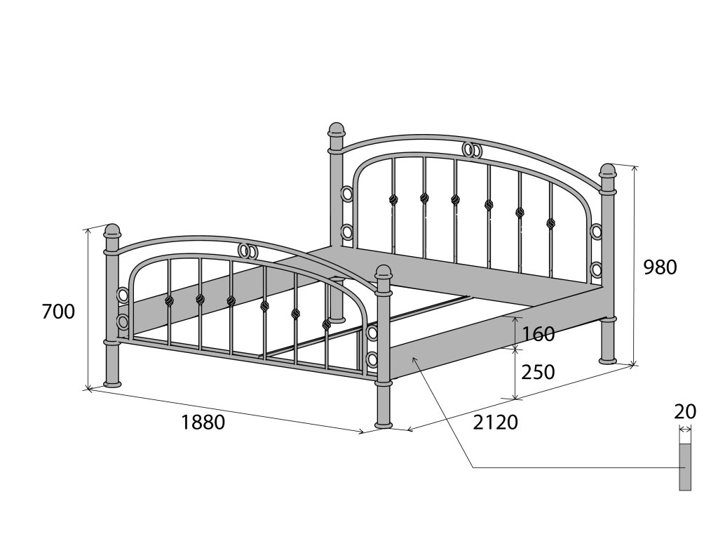Vonkajšie rozmery postele (pre dvojlôžko s rozmerom 180×200) sú 188cm x 212cm.