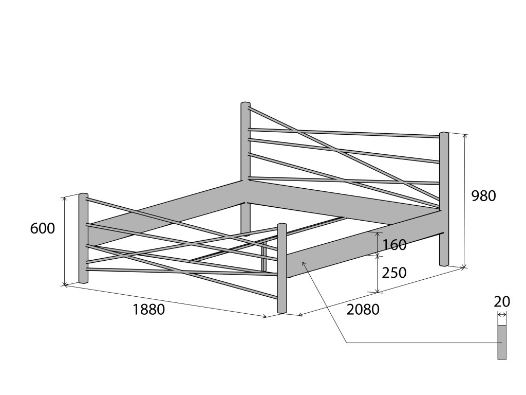 Vonkajšie rozmery postele (pre dvojlôžko s rozmerom 180×200) sú 188cm x 208cm.